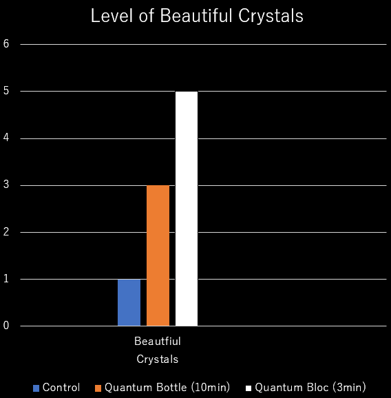 „Der Leela Quantum Bloc verbesserte die Energie des Wassers innerhalb von nur 3 Minuten erheblich. Im Kontrollwasser gab es einen schönen Kristall, wohingegen das Wasser nach der Behandlung mit Leela Quantum Tech fünf schöne Kristalle zeigte. Die Leela Quantum Wasserflasche optimierte das Wasser ebenso. Im Vergleich zum Kontrollwasser mit einem schönen Kristall, entstanden nach 10 Minuten drei schöne Kristalle.”