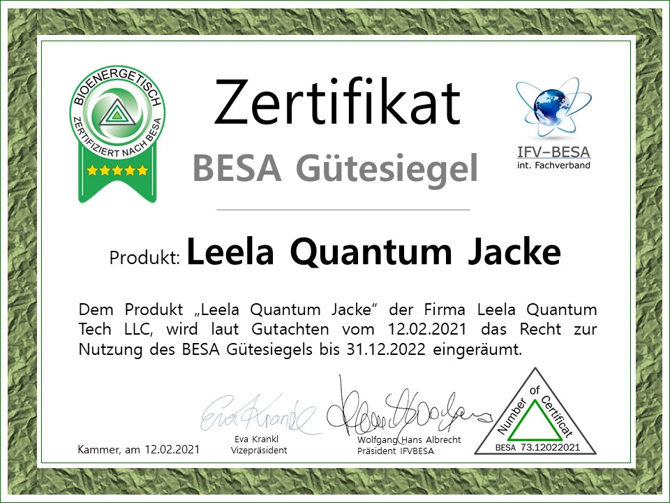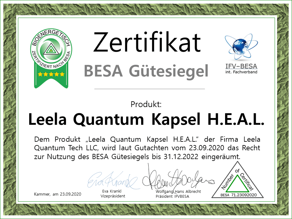 Dabei wird die bioenergetische Feedback eines Menschen direkt erfasst und messbar gemacht. Produkte, die das BESA-Gütesiegel erhalten, haben positive und wohltuende Effekte auf die Vitalität, das Wohlbefinden und die persönliche Weiterentwicklung.